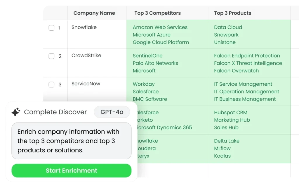 If you can write a clear instruction in plain English, like “Look at this company’s website and tell me which CRM they use,” you can use Complete Discover.
