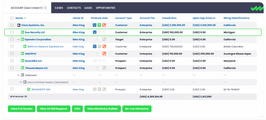 Our sales model … [makes it] very important for the sales reps to be able to see all the subsidiaries under a particular account. Complete Hierarchies has allowed us to do that in a very scalable way.